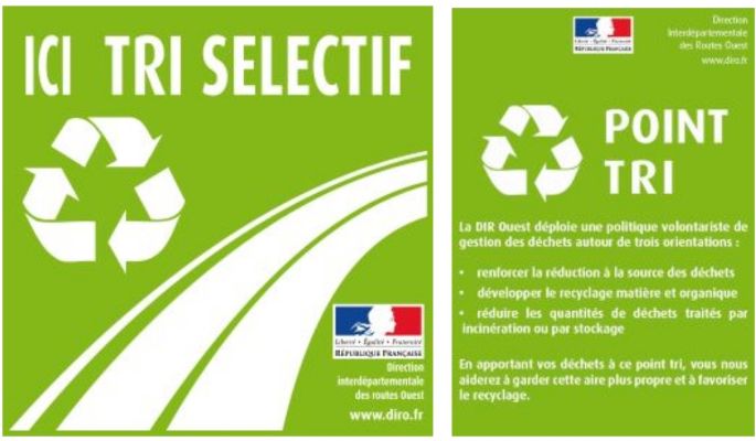 Depuis 2015, la DIR Ouest étend progressivement le tri sélectif : en 2026, 20 aires sur 20 sont équipées pour le tri séparer du verre, des emballages recyclables et des ordures ménagères résiduelles. Les autres aires disposent de bacs classiques, mais toutes appliquent une politique stricte contre les dépôts sauvages, passibles d’amendes pouvant aller jusqu’à 75 000 € (article L541-46 du Code de l’environnement).