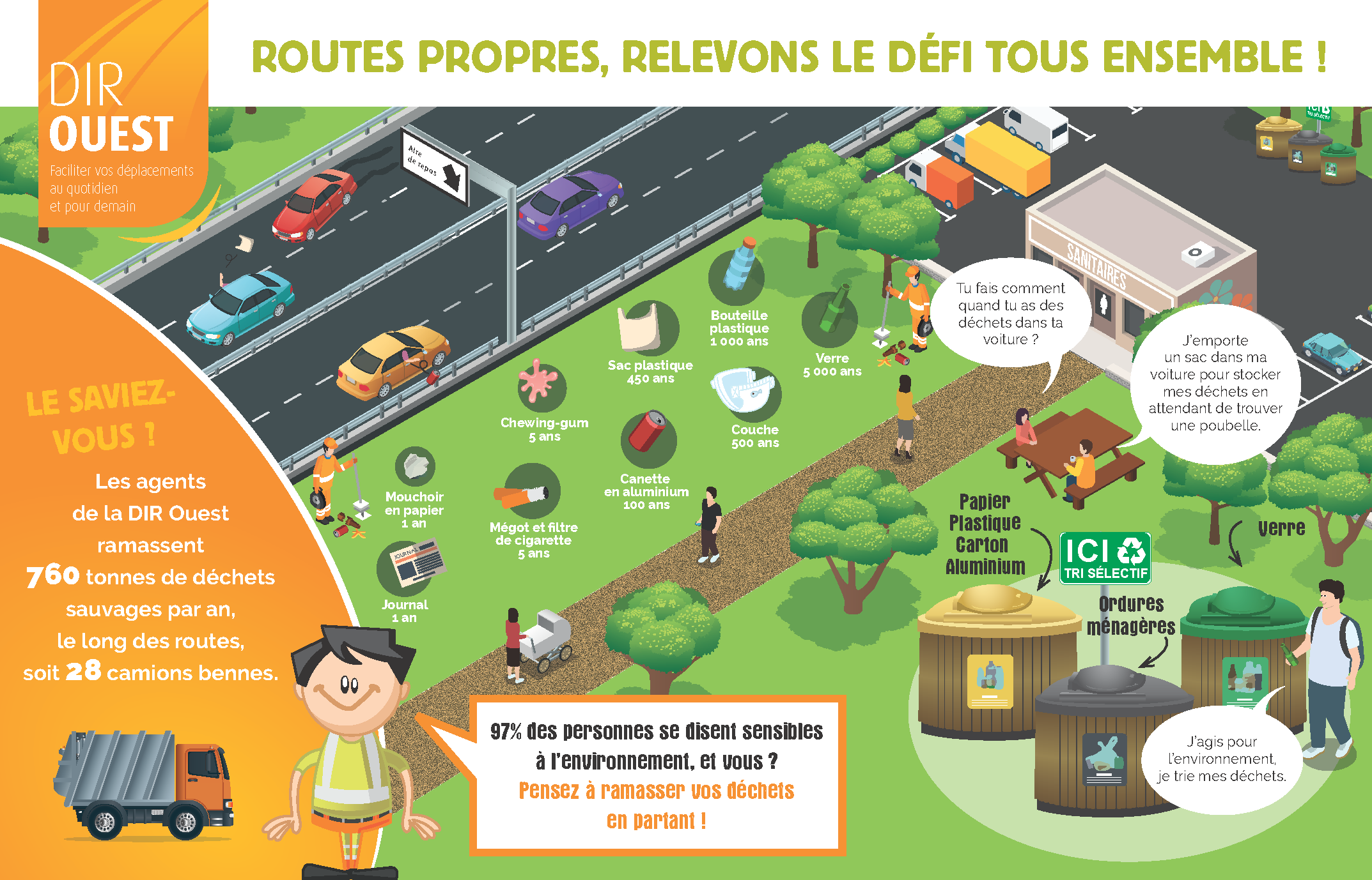 La Direction interdépartementale des routes Ouest (DIR Ouest) agit au quotidien pour préserver la propreté et l’environnement sur son réseau. Sur les aires de repos et de service sous sa gestion (hors concessions privées), elle organise la collecte et le traitement des déchets générés par les usagers en déplacement. Ce service, encadré par le Code de l’environnement, vise à limiter les pollutions et à encourager le recyclage.