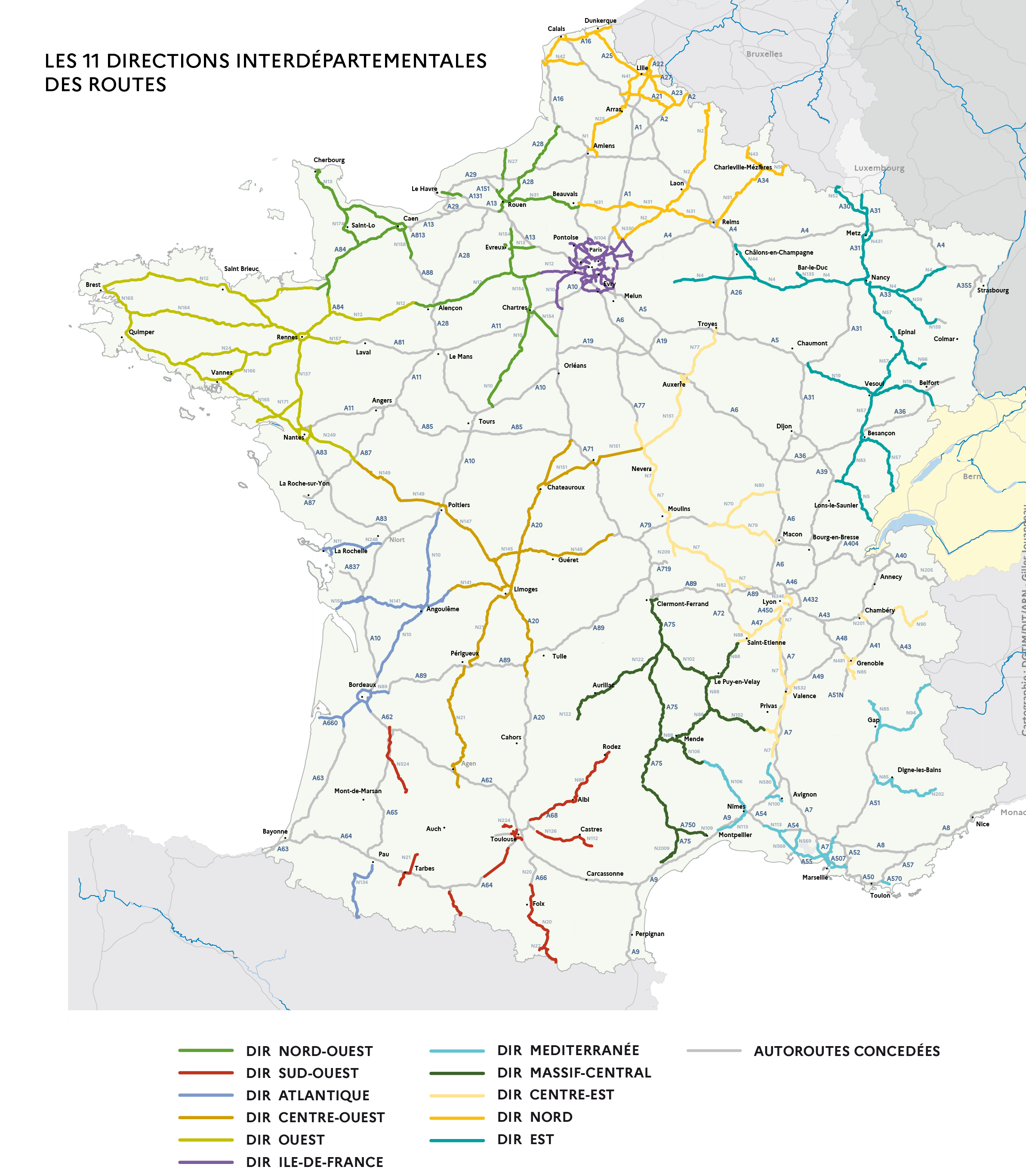 Pour un meilleur service aux usagers, le ministère des Transports a décidé de créer, en 2006, 11 DIR réparties sur l’ensemble du territoire. Le périmètre d’intervention de chaque DIR (1 100 kilomètres en moyenne) couvre des itinéraires complets et cohérents et s’affranchit des limites administratives.